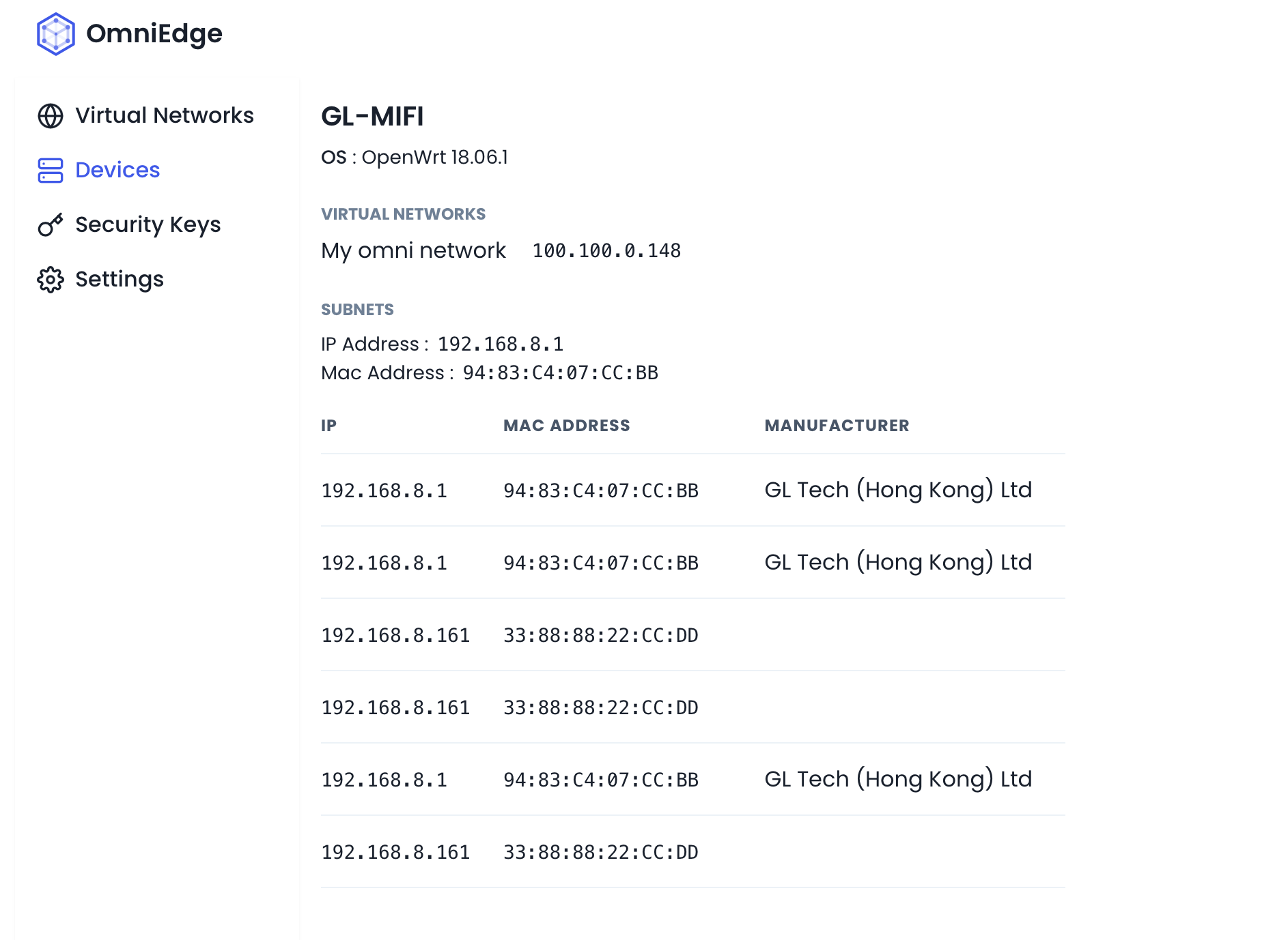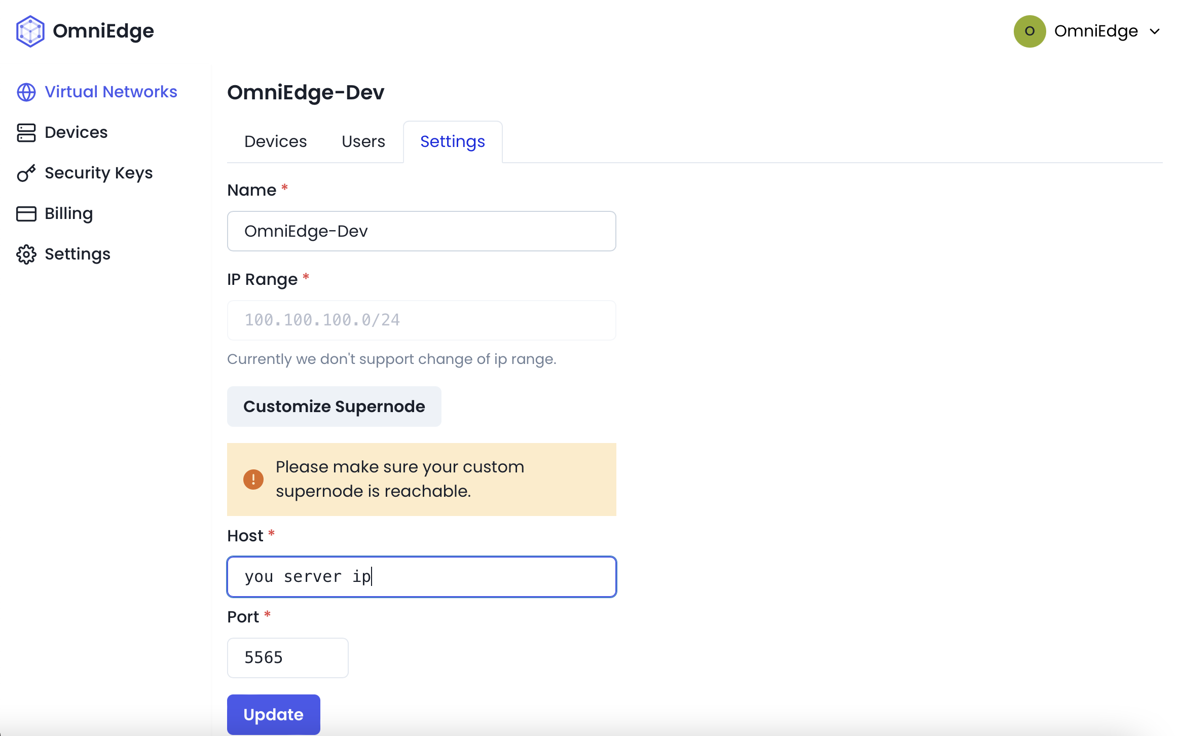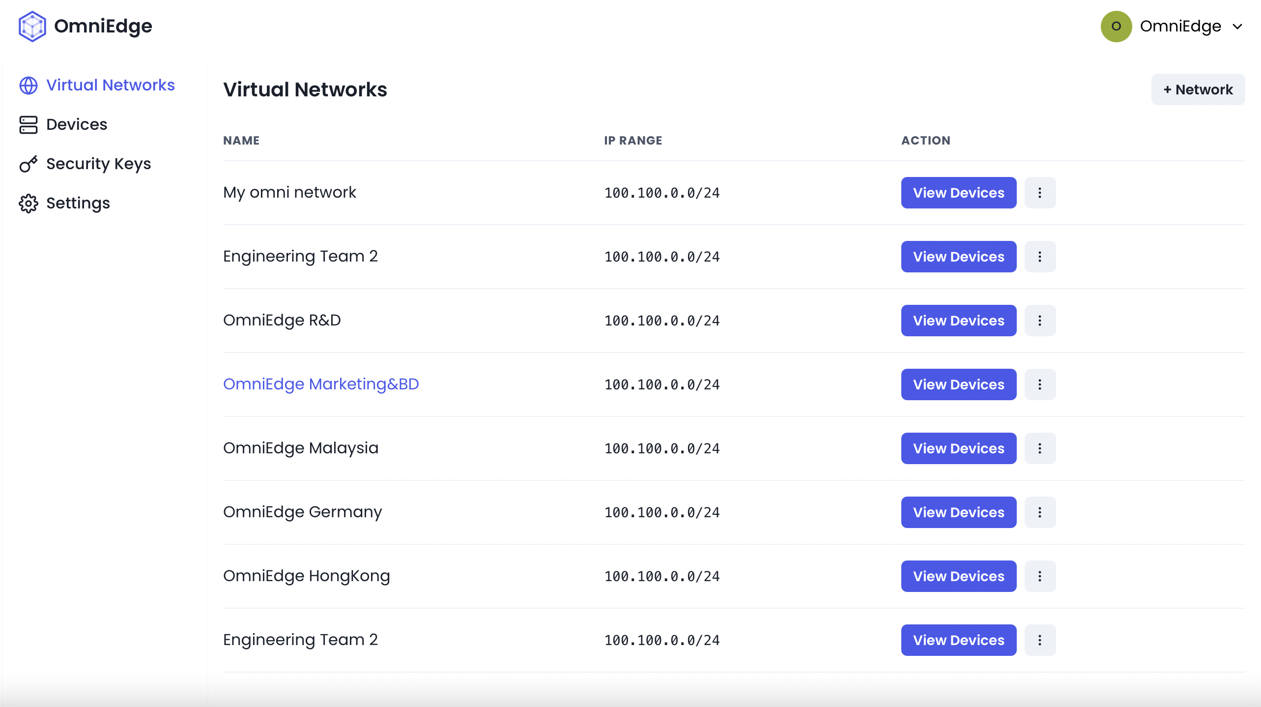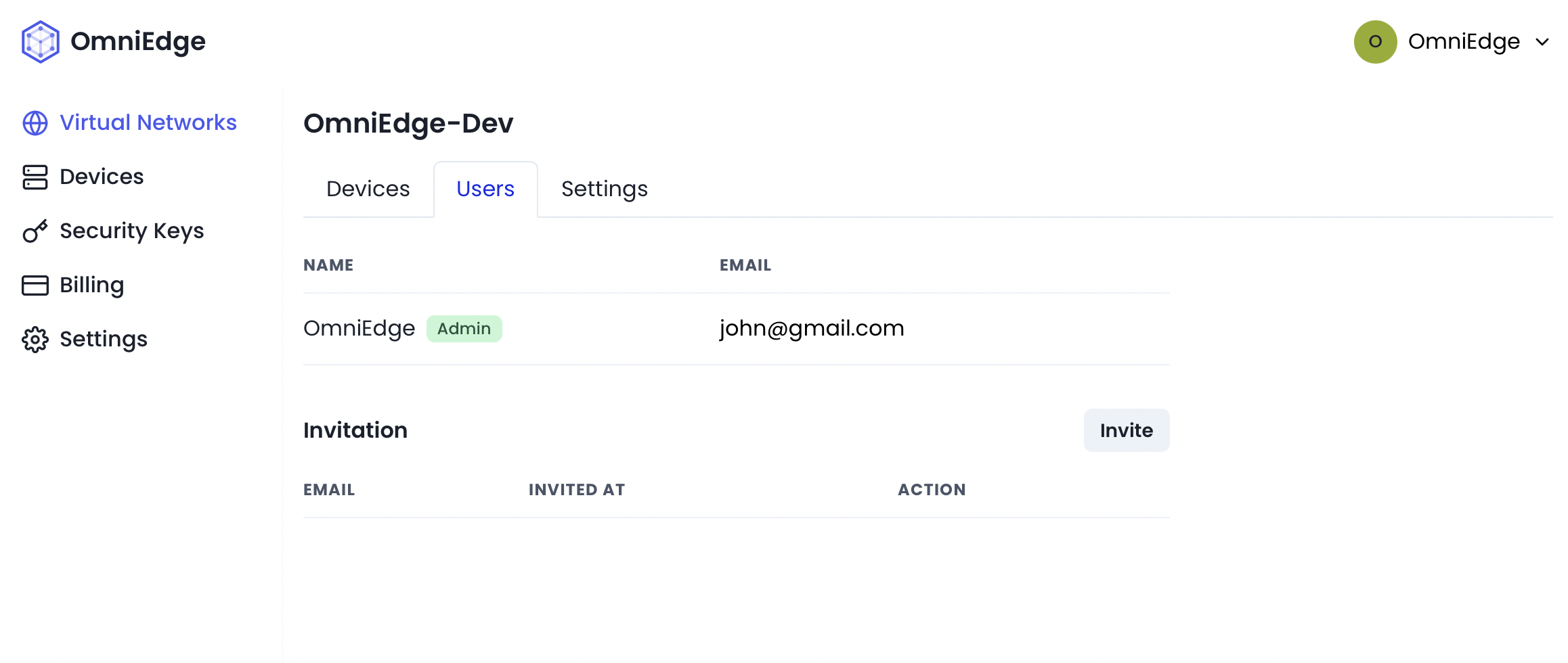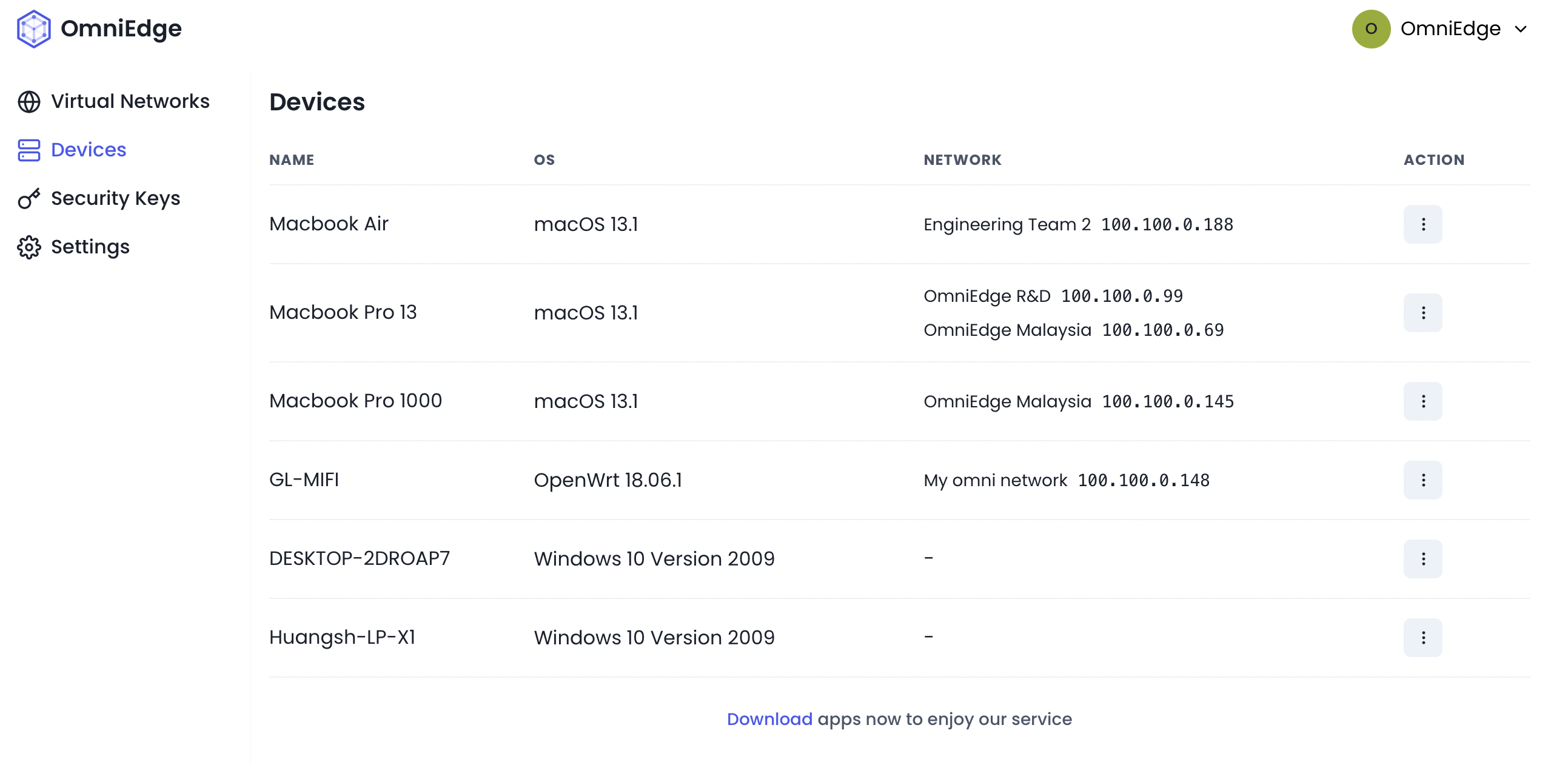 You can access the admin dashboard by login in OmniEdge, there are Virtual Network, Devices, Security Key, and Settings pages you can manage your service.