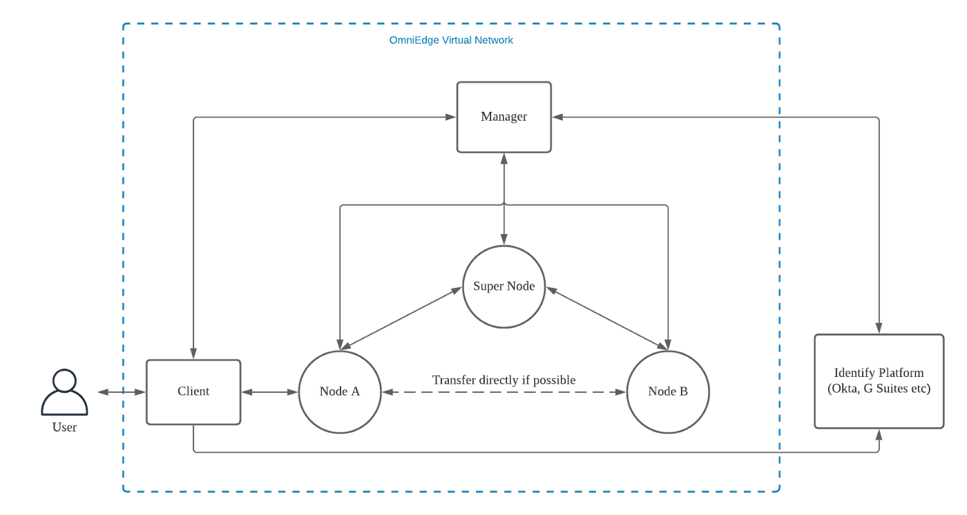 For the above design goals, we get inspired by an open-source VPN software: n2n, and designed the main architecture of OmniEdge.