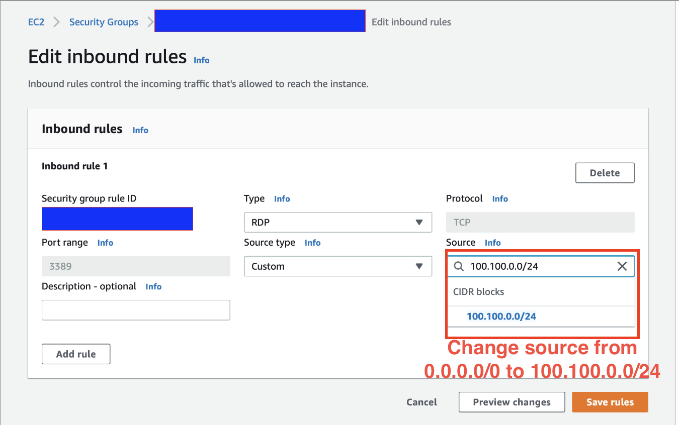 Log into your AWS EC2 Console, select your windows EC2, and change the security group setting, in the Edit Inbounds rules setting,change the source for RDP from 0.0.0.0/0 to 100.100.0.0/24.
