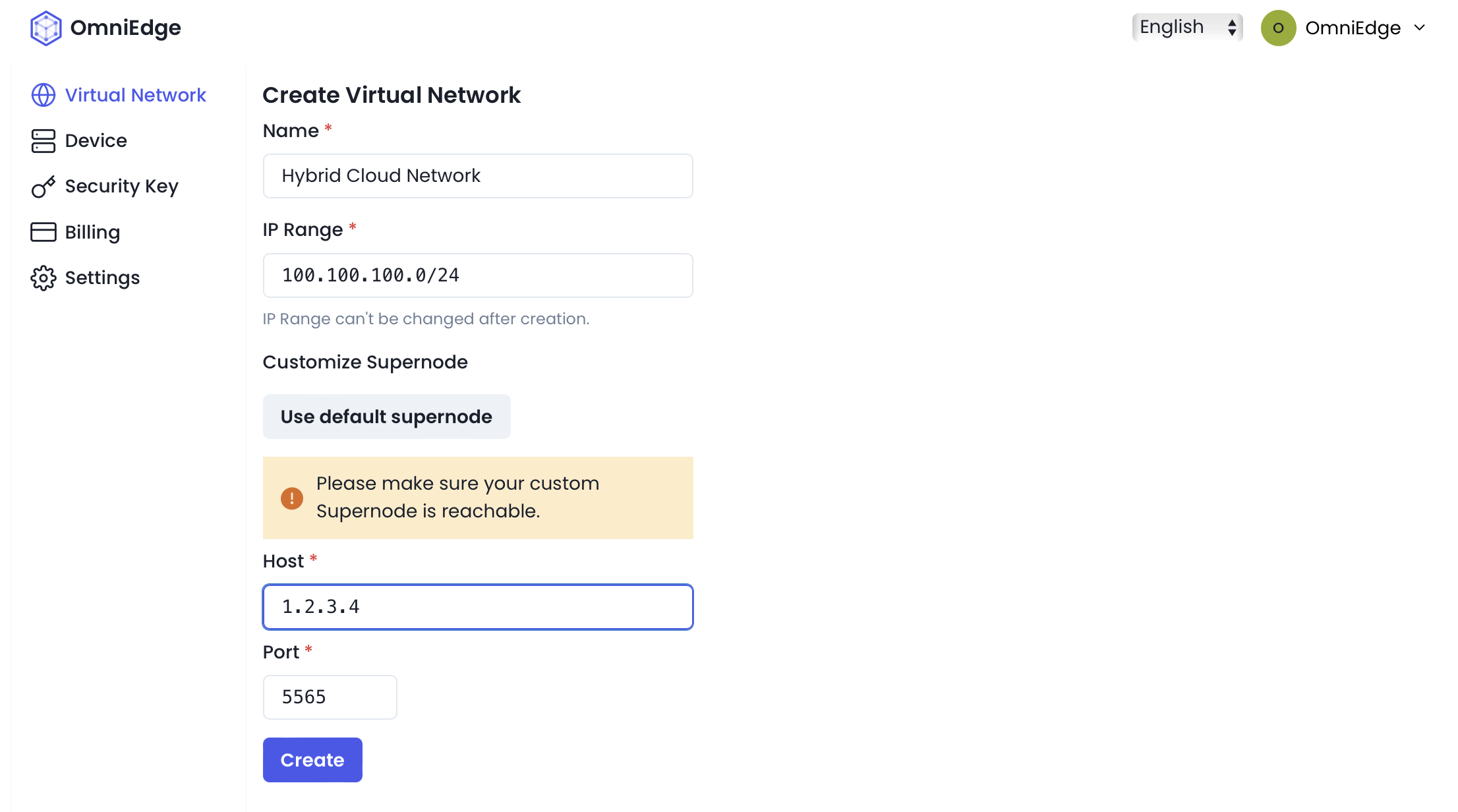 Follow the Customize Supernode Installation instruction to install the customize supernode on one of your public cloud, open the related port,here with 5565, you can use any port you want. Put the IP and port into the virtual network setting page, see picture in item 2.