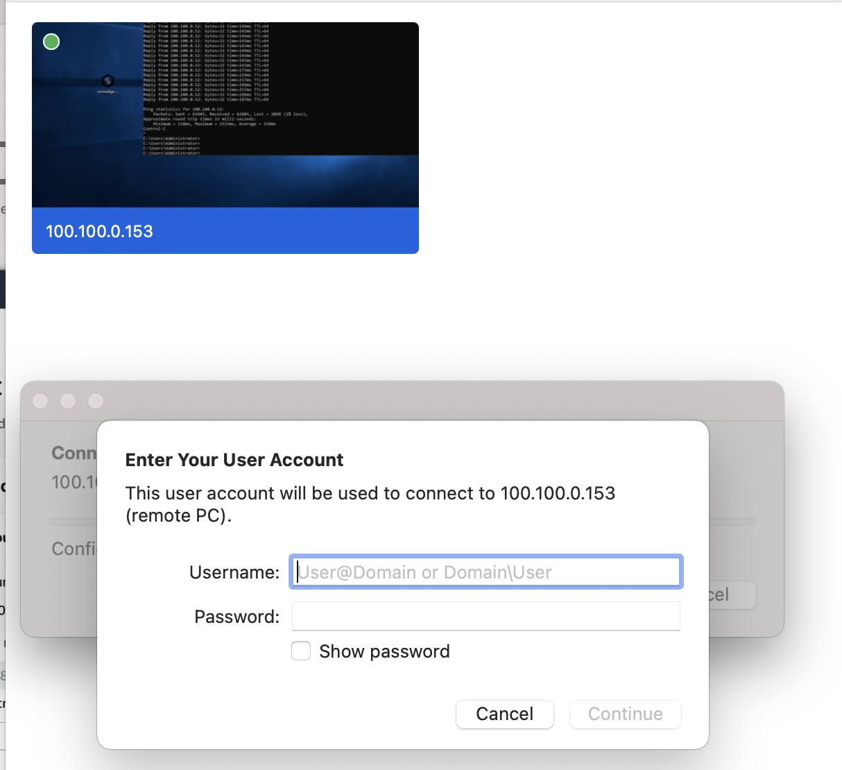 Connect your virtual network on your own laptop, and open your RDP and input the IP of the AWS EC2 100.100.0.153, your AWS EC2 only accepts your private IP ranges now.