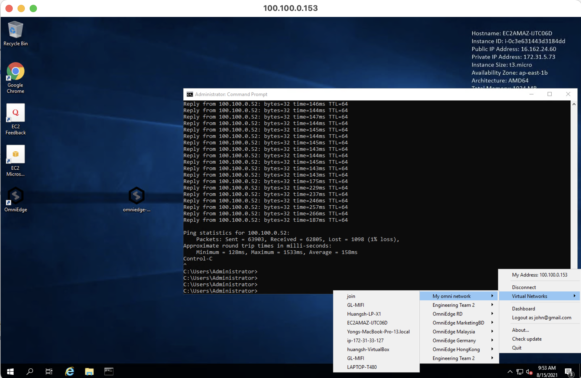 First RDP connects to your windows EC2 with its public IP, install and Run OMNIEDGE windows Client, join the virtual network of your team, here we have My Omni Network, you will have an IP for this EC2, let's say: 100.100.0.153. After that, your EC2 now joins the team virtual network.